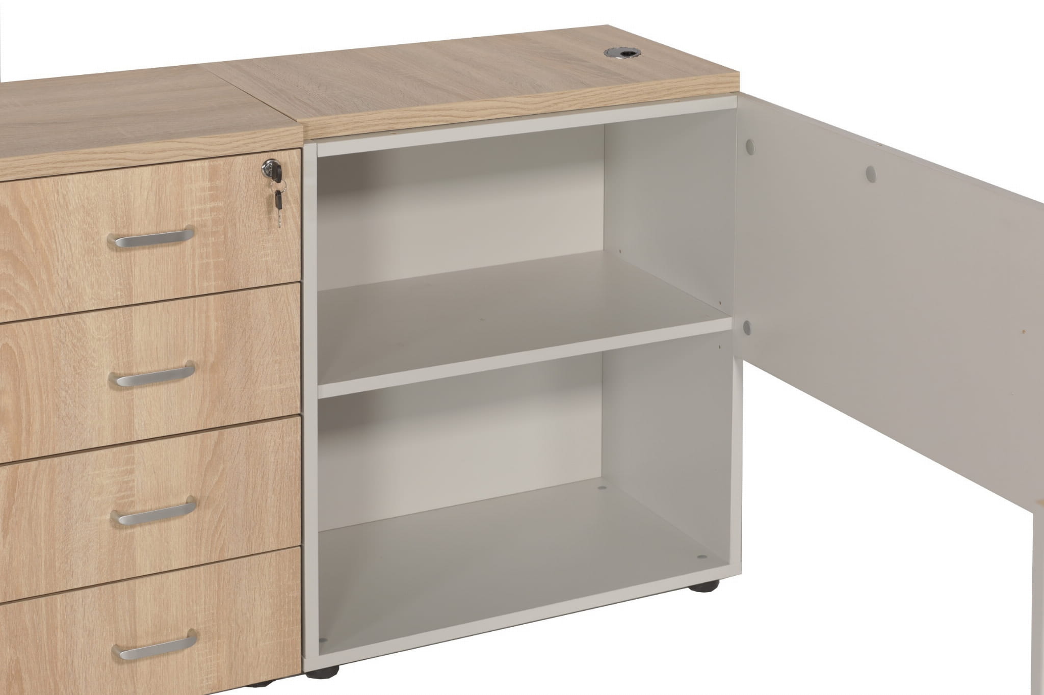 Opis: Biurko prostokątne z szafką na komputer i drukarkę po lewej stronie