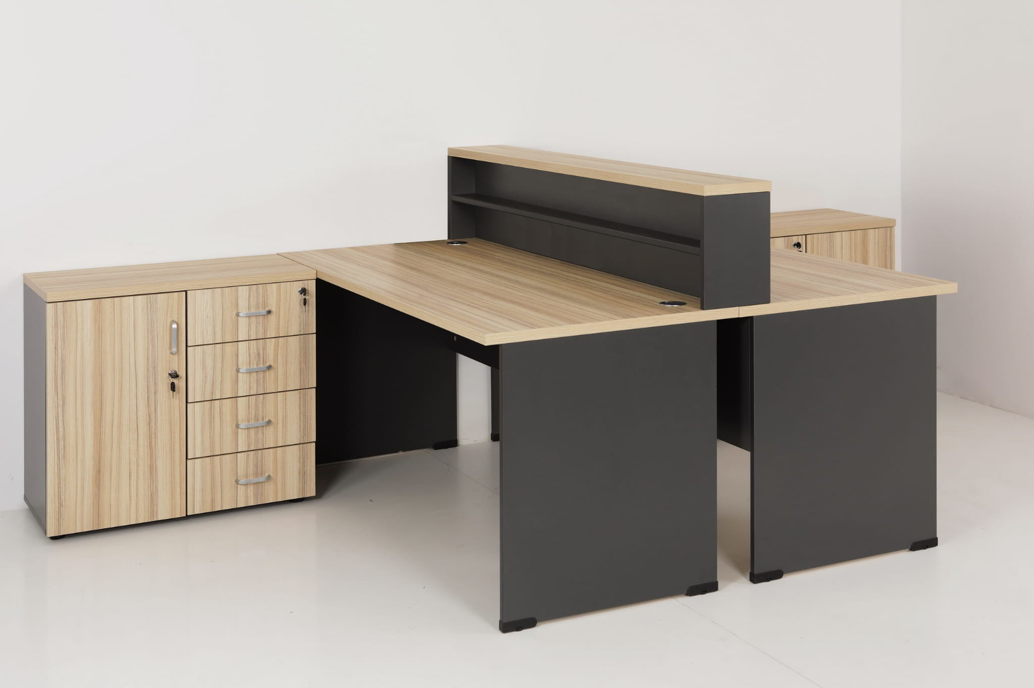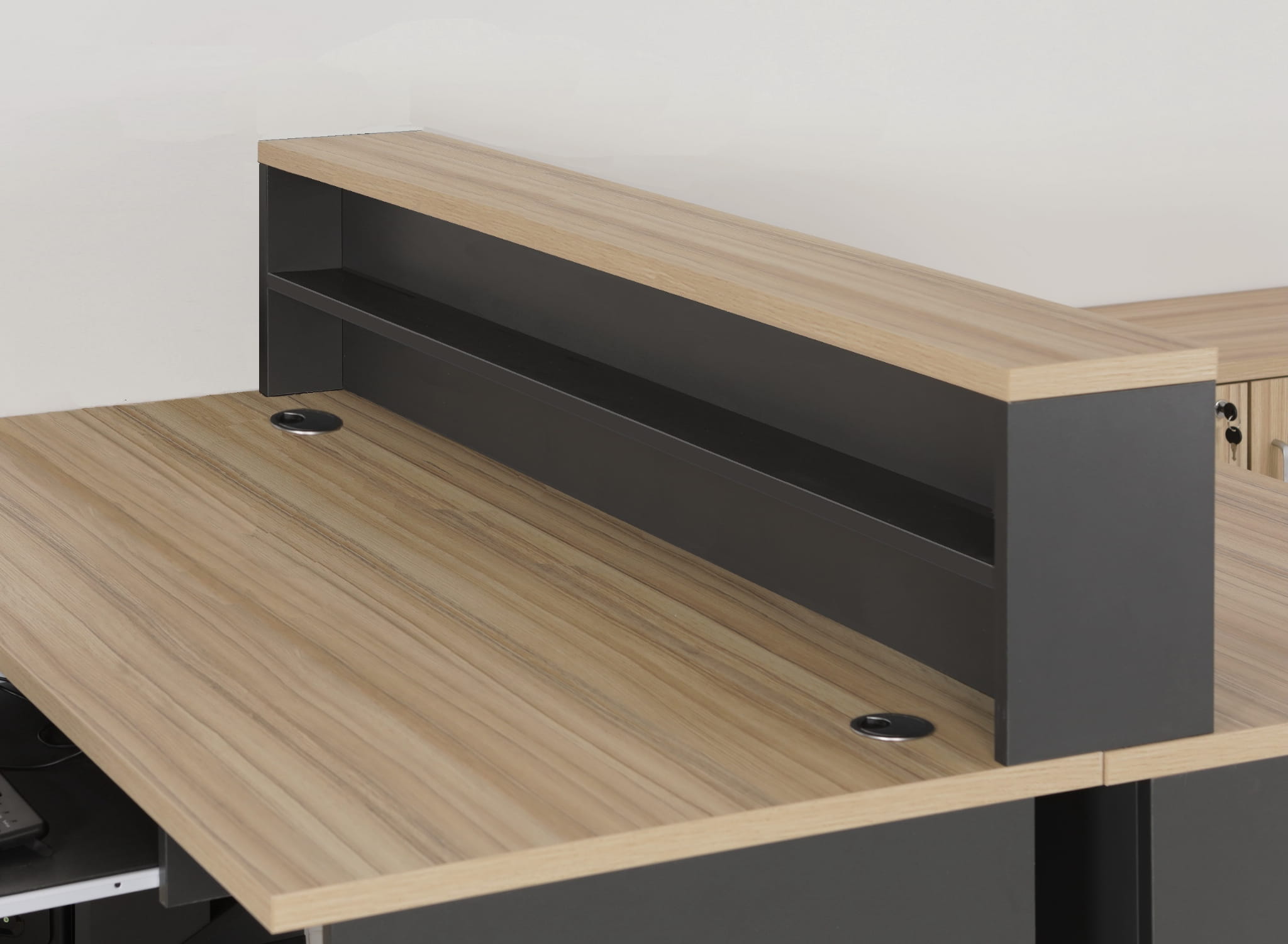eOP-55-A-160 przegroda z półkami nastawiana między dwa połączone biurka szerokości 160 cm.