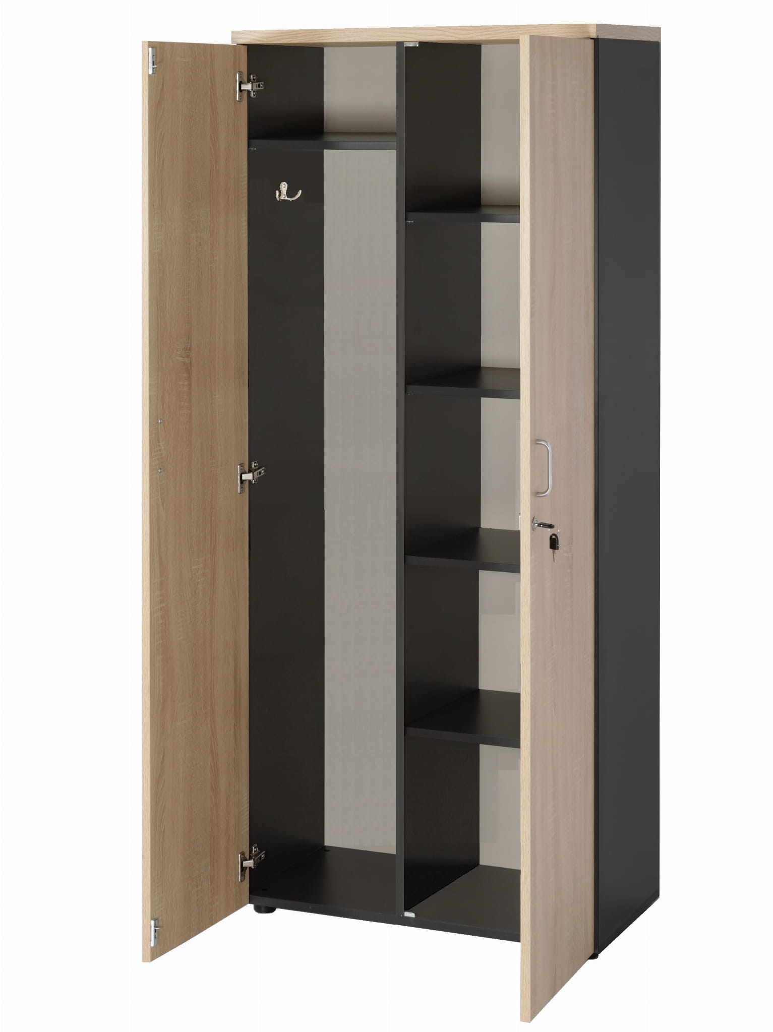 Opis: Regał biurowo-ubraniowy z lewej haczyki na bokach regału na ubrania, po prawej półki na segregatory 5 poziomów, drzwi z zamkiem