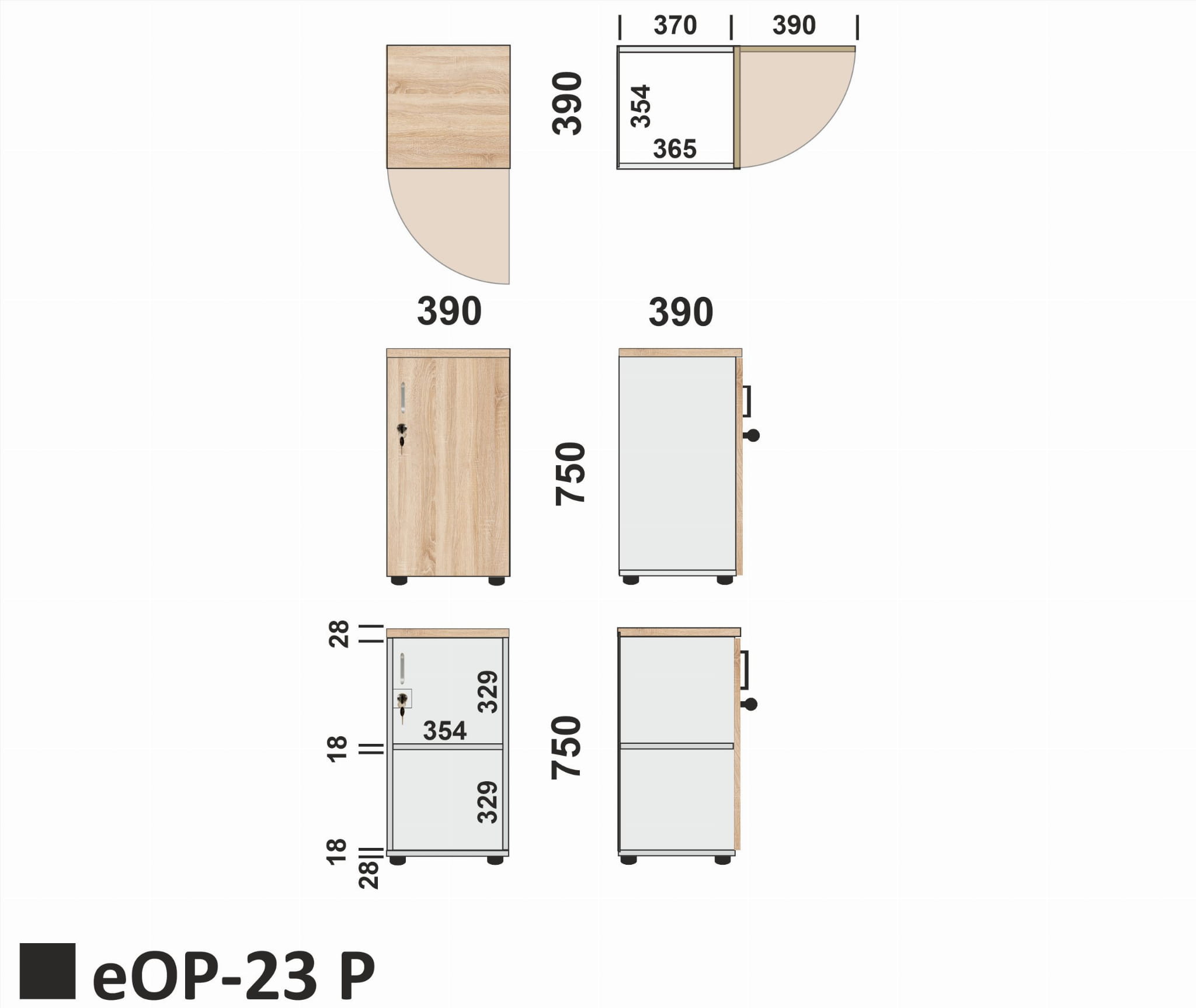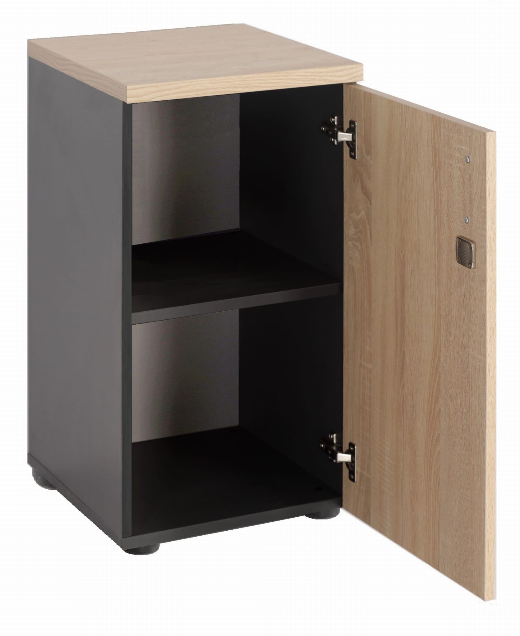 Opis: Regał jednodrzwiowy otwierany na prawo, dwupoziomowy z tyłem z płyty HDF 3mm