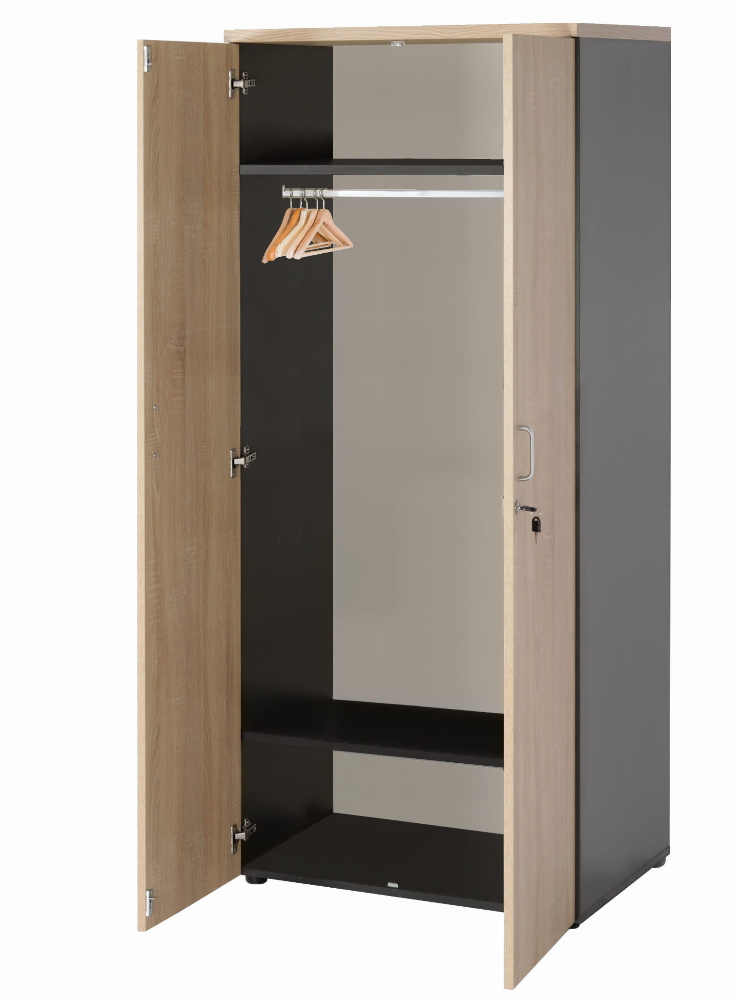 Opis: Regał ubraniowy z drążkiem na wieszaki, drzwi z zamkiem.