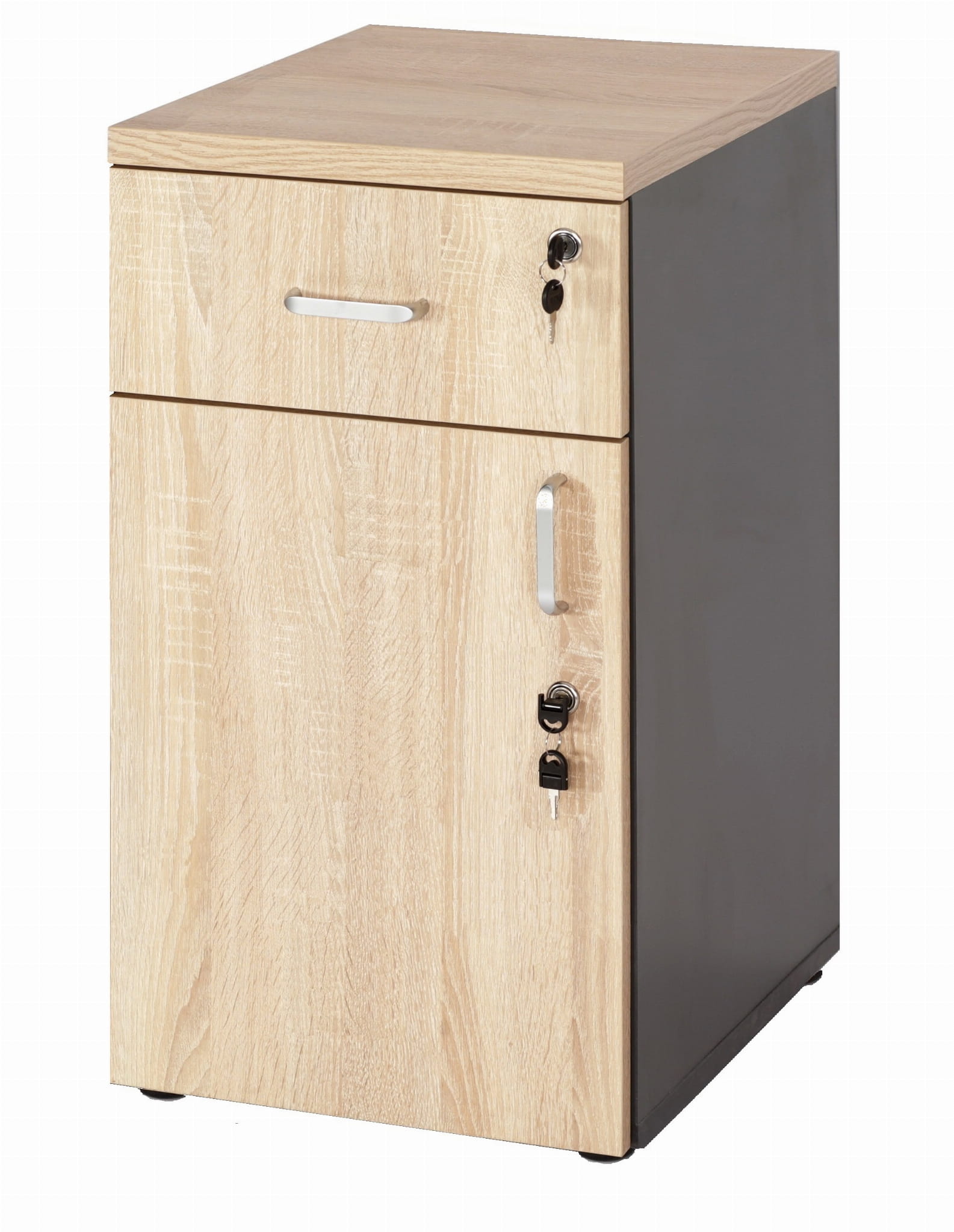 Opis: Kontener do biurka lub wolnostojący, 1 szuflada z zamkiem + 1 drzwi i półka w środku