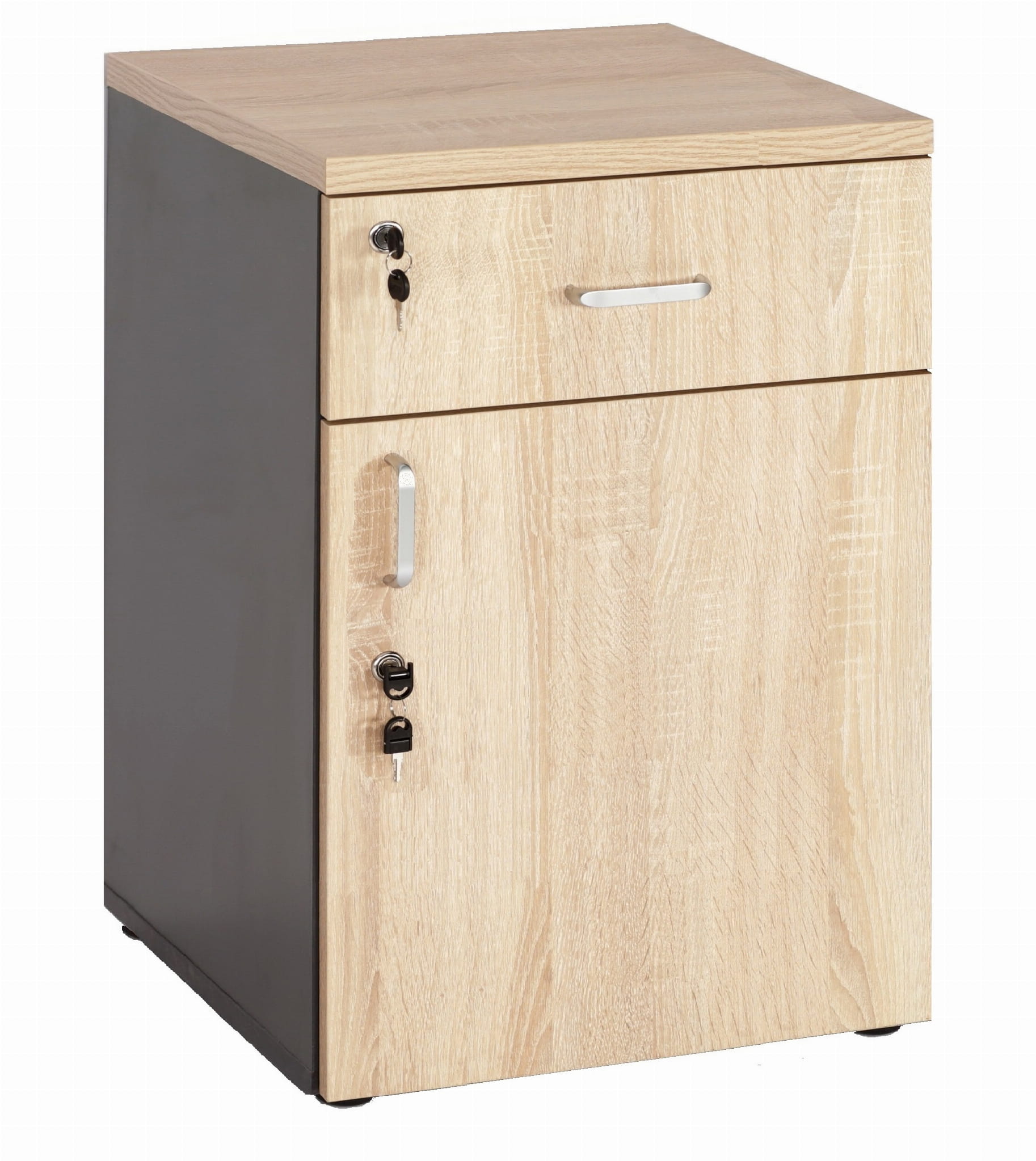Opis: Kontener do biurka lub wolnostojący, 1 szuflada z zamkiem + 1 drzwi otwierane na prawo i półka w środku